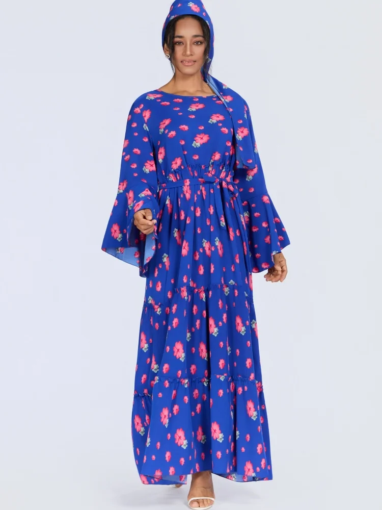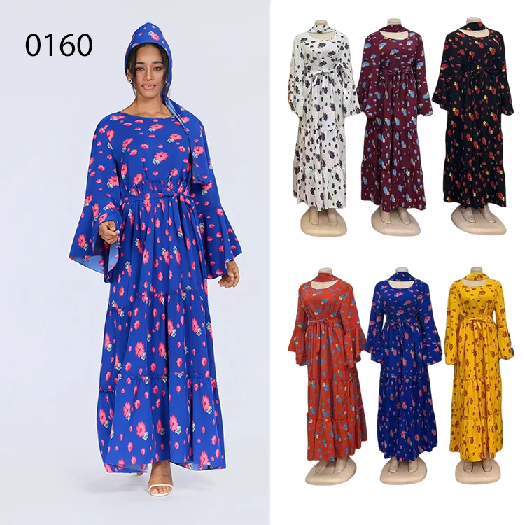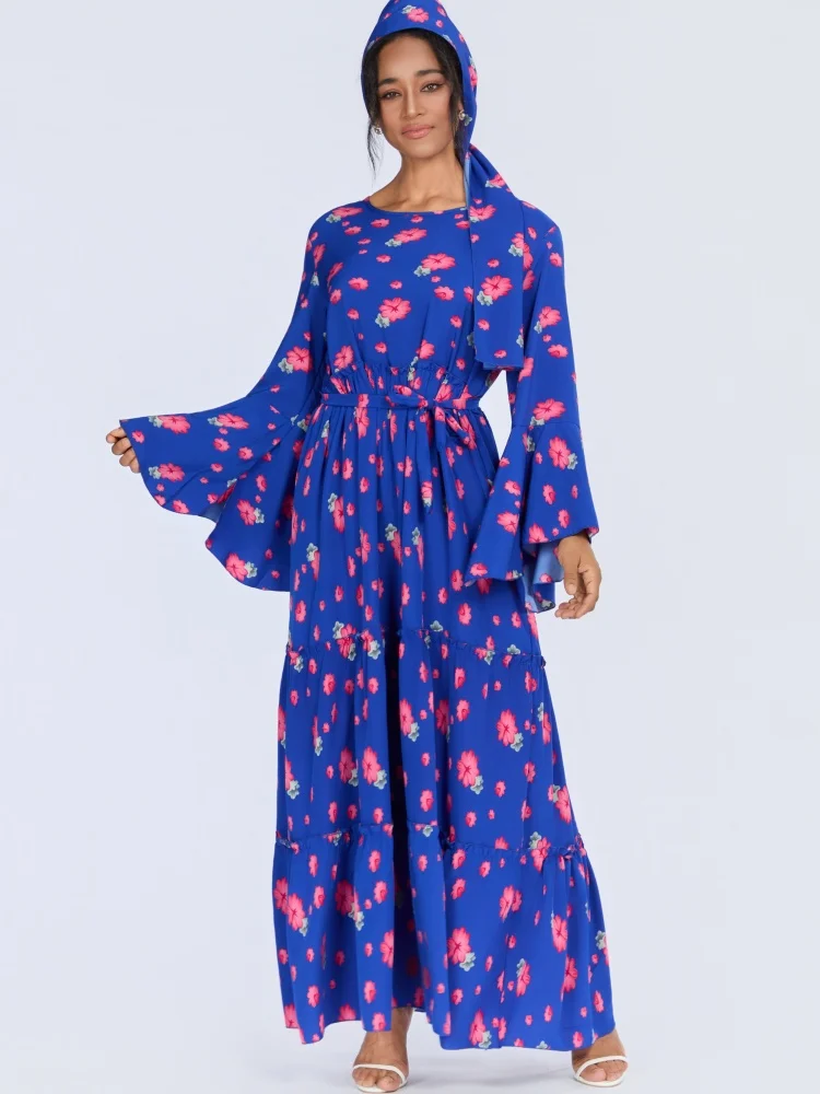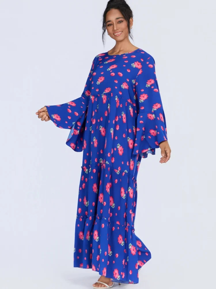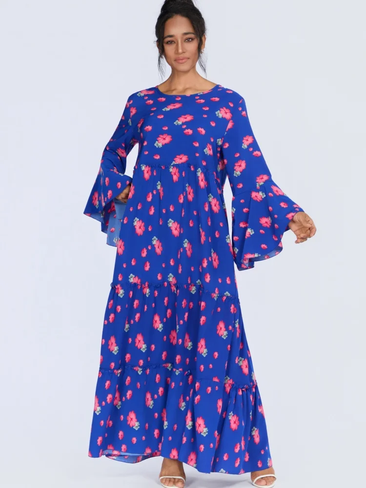 Wholesale Middle East Muslim Robe Fashion Women Printed Round Neck Long Sleeve Dress